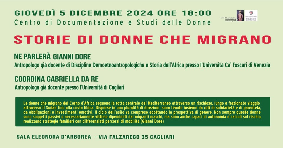 Giovedì 5 Dicembre 2024 alle h. 18.00, nella Sala Eleonora d’Arborea in via Falzarego 35/37 a Cagliari, il Centro di Documentazione e Studi delle Donne organizza un incontro sul tema