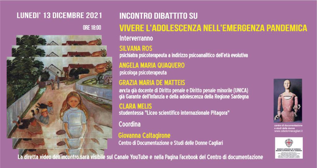 Interverranno Silvana Ros – psichiatra psicoterapeuta a indirizzo psicoanalitico dell’età evolutiva Angela Maria Quaquero – psicologa psicoterapeuta Grazia Maria De Matteis – avv.ta già docente di Diritto penale e Diritto penale minorile (Università di Cagliari), già Garante dell’Infanzia e della adolescenza della Regione Sardegna Clara Melis – studentessa “Liceo Scientifico internazionale Pitagora”