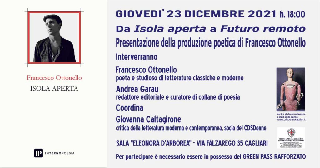 Interverranno Francesco Ottonello – poeta e studioso di letterature classiche e moderne Andrea Garau – redattore editoriale e curatore di collana di poesia Giovanna Caltagirone – critica della letteratura moderna e contemporanea, socia del CDSDonne