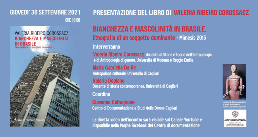 «Basato sui racconti biografici di un gruppo di uomini bianchi di classe medio-alta di Rio de Janeiro, il volume indaga cosa significa essere classificati come bianchi e come uomini in una società strutturata sul razzismo e sulla diseguaglianza tra i sessi e le classi.[…] Il volume rappresenta un contributo originale per l’analisi femminista dell’intersezione delle relazioni sociali tra sessi, classi e “razze” e per un’antropologia dei gruppi dominanti» (dal risvolto di copertina di Valeria Ribeiro Corossacz, Bianchezza e mascolinità in Brasile. Etnografia di un soggetto dominante, Mimesis 2015)
